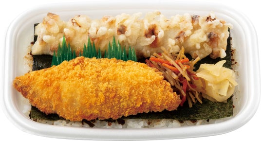 ごはんの上におかか昆布とのりをのせ、衣はサクサク、身はホクホクの白身魚のフライと食べ応えたっぷりのちくわ天を盛り付けました。