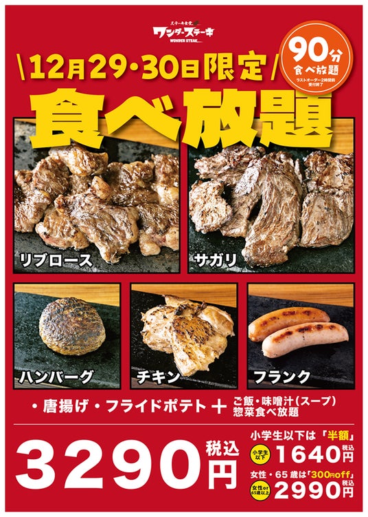 ワンダーステーキ泉南店を展開する株式会社C-HUNDRED(所在地:大阪府大阪市北区)は、ワンダーステーキの店舗にて、12月29日&30日の二日間に「ニクの日&年忘れ企画」と題した人気商品5種の食べ放題企画を実施します。