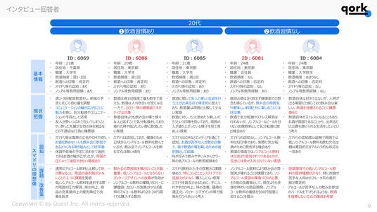 - 20代~40代の男女9名にオンラインデプスインタビューを実施(飲酒習慣あり5名、なし4名)