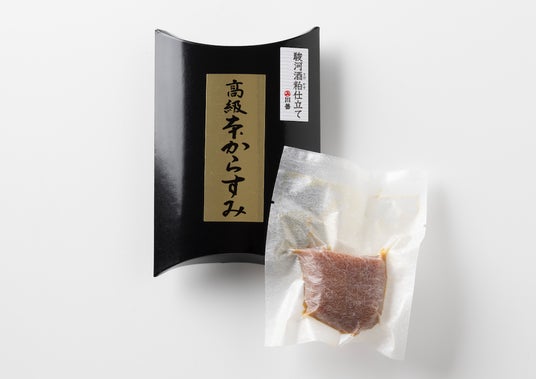 今回、「駿河酒粕仕立て 高級本からすみ」として数量限定で発売することにいたしました。酒粕は、200余年の歴史をもつ老舗の酒蔵・高嶋酒造株式会社の新酒の酒粕をお譲りいただきました。純米酒粕をじっくり寝かせて仕上げた本からすみは、美容や健康に関心のある方に味わっていただきたい逸品です。