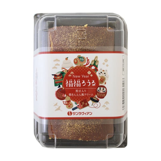 「福福ろうる」はお正月の定番〈栗きんとん〉をイメージした風味豊かなクリームと、岡山県産作州黒豆を贅沢に使用したロールケーキ。栗きんとん風クリームを包んだカステラ生地はたっぷりの卵と蜂蜜を使用し、しっとり柔らかい食感に焼き上げました。仕上げに散りばめた金粉が華やかさを添えた、新春のお祝いの席にぴったりなスイーツです。新年を祝う特別なひとときに、この「福福ろうる」をぜひご賞味ください。