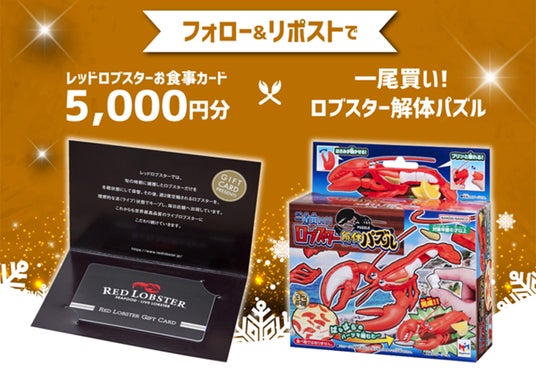 レッドロブスター公式Xとメガハウスのメガトイ公式Xをフォローし、対象のポストをリポストしていただいた方の中から抽選で「レッドロブスターギフトカード5,000円分」と「一尾買い!!ロブスター解体パズル」をセットで合計10名様にプレゼント致します。