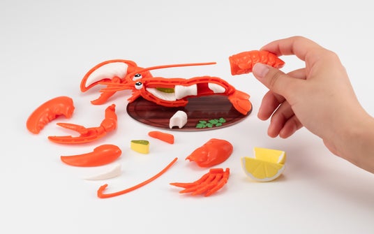 ロブスターの部位のパーツを正しい位置に組み合わせ楽しめる全長約14.5cmの立体パズルです。部位は、甲殻の部分(はさみ・脚・腕・尾等)と身の部分の全32個パーツで構成されていて、全てのパーツを使い組み合わせるとロブスターが完成します。ロブスターは、皿シートに置いて付属のレモンを添えて飾ることができます。また、頭部と腹部の間をはずすとロブスター独特のぷりっとした中身が出てきたり、大きなはさみを動かしたりとギミックでも遊ぶこともできます。