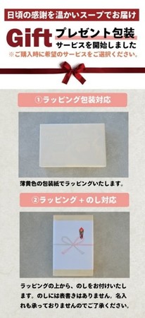 また、年末年始にかけ、お世話になっている身近な方へのプチギフトとしてもご活用いただけるよう、ギフトプレゼント包装サービスのご提供を開始いたしました。「オニオングラタンスープ 10個セット」を『ごちtabi』楽天市場店にてご購入いただいたお客様にご利用いただけます。本格的に冷え込むこれからの季節にぴったりな「オニオングラタンスープ」に日頃の感謝の気持ちを乗せ、ご家族やご友人にプレゼントしてみてはいかがでしょうか。