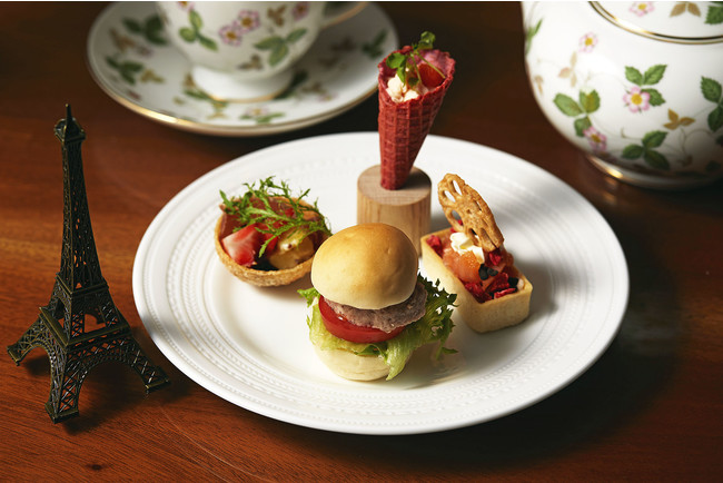 今回のメニューでは、苺を使ったスイーツ5種と、それに合わせたセイヴォリー4種、そしてスコーンとフィナンシェがお楽しみいただけます。パリで生まれ、パリの有名店でパティシエとしての礎を築いたファビアンは、ゲストの皆様に少しでもパリの雰囲気を感じていただこうと、それぞれのスイーツにはフランスの貴婦人の名前を、セイヴォリーにはフランスの紳士の名前をつけました。