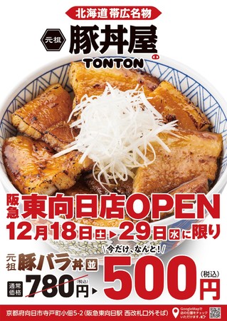 東向日店のオープンを記念して、12/18(土)~29(水)に限り、当店自慢の「豚バラ丼〈並〉」を特別価格500円にて提供いたします。