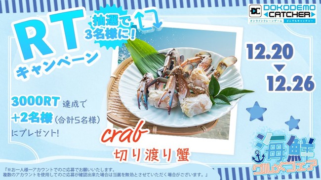 株式会社DC7(本社:京都府京都市 運営:大阪府大阪市)が運営するオンラインクレーンゲーム「どこでもキャッチャー」にて、お鍋にぴったりな蟹やマグロなどの海鮮グルメが多数をラインナップされたグルメフェア開催いたします。合わせてVtuberの配信PRも実施いたします。