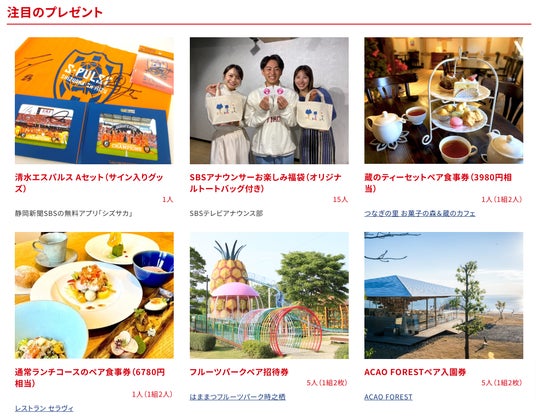 応募は「グルメ」「施設」「静岡新聞SBS」の各カテゴリーをタップして、欲しいアイテムの「応募する」ボタンを押すだけ。これまで知らなかった地元の人気スポットやレストランの情報に出合うきっかけにもなるはず。画像を眺めているだけで心が躍ること間違いなしのサイトをぜひ訪れてみてください。