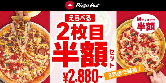 ピザハットは、大好評をいただいた「えらべる2枚目半額セット」を、お客様からの「また利用したい!」という熱いご要望の声にお応えして、この度、3月9日(日)まで延長をすることにいたしました!