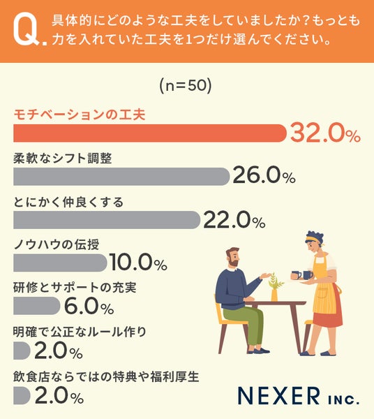 さらに従業員が辞めてしまわないために「モチベーションの工夫」や「柔軟なシフト調整」などの工夫に取り組んでいる方も多いようです。