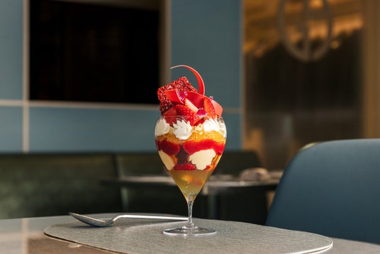 主役になるのは、アニスが香るスパイシーな苺のソルベと、ほろ苦いアッサムティーがアクセントとなる濃厚なバナナジェラート。その下の、みずみずしいデコポンやアーモンドのクランブルと一緒に、食感と味わいの変化をお楽しみください。