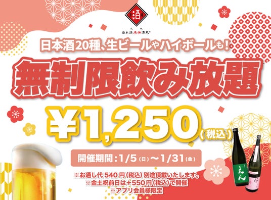 日本酒原価酒蔵(http://sake-genkabar.com) にて時間無制限飲み放題を1/5(日)~1/31(金)まで期間限定で実施致します。当キャンペーンでは生ビールやハイボール、サワー類はもちろん、特定名称酒をメインとした日本酒20種も含まれた大変お得なキャンペーンとなっております。