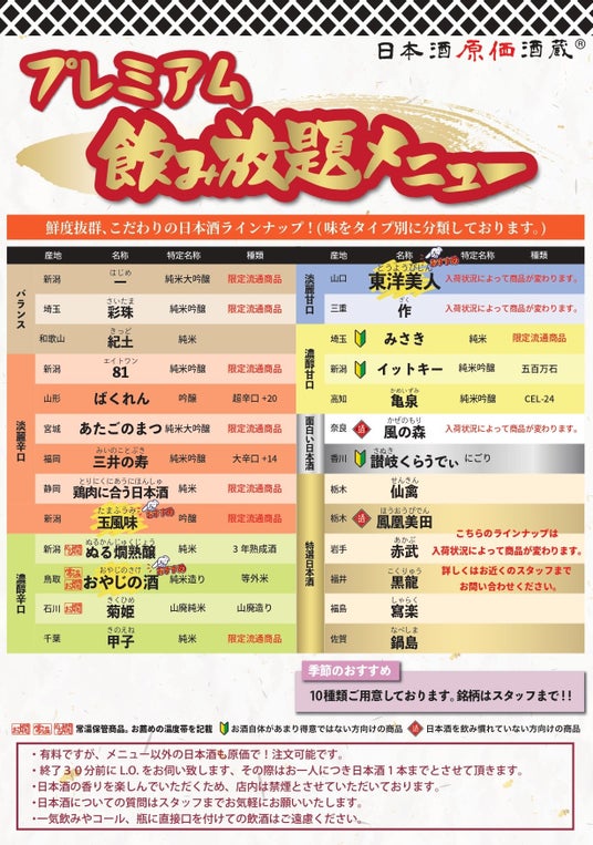 ・お1人様+¥500(税込¥550)で日本酒が35種になるプレミアム飲み放題への変更も可能です
