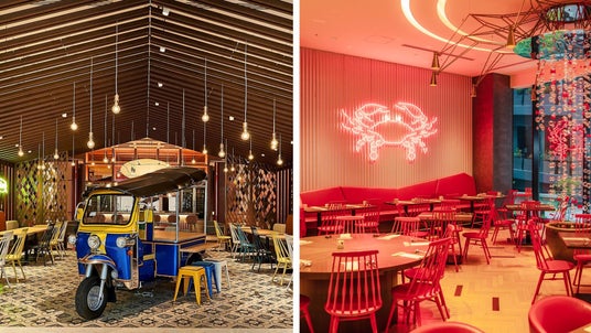 ホテル2階にあるタイ料理レストラン「スアンブア」のエントランスには、タイを象徴するトゥクトゥクが飾られ、タイの伝統的なパターン柄を現代風にアレンジしたインテリアが美しい店内には、本場さながらのスパイスの香りが漂います。隣接するシーフードレストラン「エンバシー・オブ・クラブ」は、アイコニックな蟹のモチーフや真っ赤なインテリア、シャンデリアが印象的でクラブマーケットの雰囲気を表現しています。
