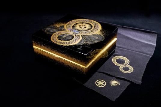 創業者 羽立道則の座右の銘である「臥薪嘗胆」のもと、羽立水産は1963年の創業以来、常に自ら出向き、味を確かめ、改善を続けてきました。この姿勢が、見えないところまで手を抜かない品を生み出し、愛され続ける逸品となっています。羽立水産3代目を担う姉妹、陽子と咲子がはだての魂を受け継ぎ、新春干支玉手箱第二弾を制作。雲から立ち上がる干支の蛇は吉数の8とウロボロスをモチーフにしたインフィニティー(??)構図。その中に永遠の恵みを願いうにを宝珠に見立て掲げる絵を配置した「生うに 暁」専用の木製総漆塗り箱~蛇~を制作。背景には蛇のうねりと幻想的な雲を思わせるラインをあしらい、さらにその背景に伝統的な柄を用いた幾何学的なうねりのエンボスを施すことにより奥行きを表現しています。