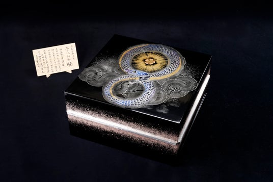 『はだての生うに』を納める木製総漆塗り箱 蛇は、大本山永平寺御用達の漆琳堂が製作。創業1793年(寛政5年)初代 忠治郎から始まる伝統ある塗師の技が、内田徹によって現代的なデザインとして昇華されました。玉手箱の木地は指物の技術を利用し特注で製作いたしました。塗りは黒本漆の塗り立て仕上げ。磨きをせず、一度の刷毛塗りで光沢のある艶を出す技法です。金箔/銀箔を使った装飾も施し、形状から塗りまで漆器の技術を詰め込んだ、豪華なパッケージに仕上がっています。本年は本金粉/本銀粉によるうに専用箸及び匙も製作。玉手箱に描かれた干支は、毎年干支ごとに新デザインで販売予定。コレクション性も高い商品となっています。