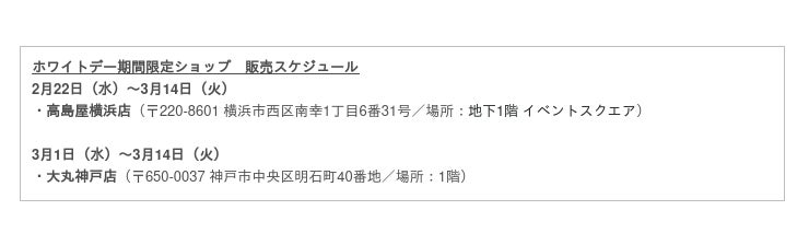 2月22日(水)から高島屋横浜店、3月1日(水)から大丸神戸店で開催する期間限定ショップでは、昨シーズン累計で約250万枚販売した生チョコレートサンドクッキー「スノーサンド」ホワイトデー限定缶が登場致します。春の訪れを感じる、軽やかな淡いイエローのパッケージは、ホワイトデーはもちろん、春のギフトシーンにお使いいただけます。