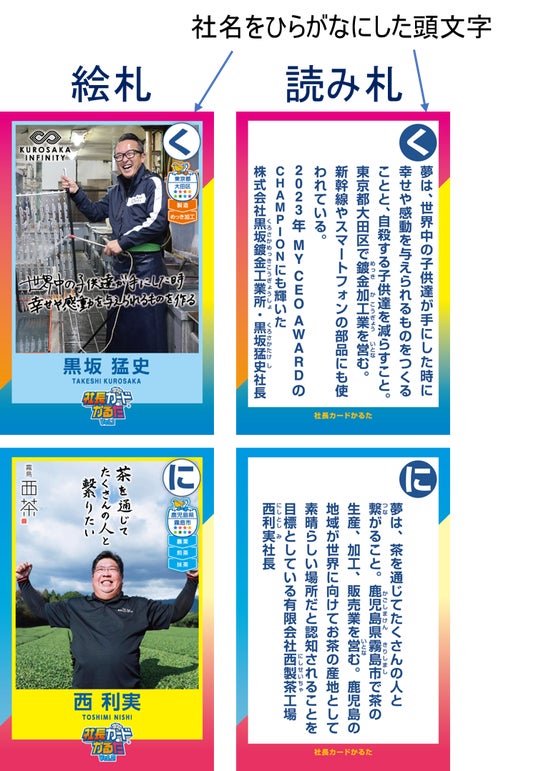 右上には絵札と同じ社名をひらがなにした頭文字が記され、社長の夢→事業内容→実はスゴイ会社の特徴や豆知識→社名→社長名の順で読み文が構成されています。その会社の詳細情報を覚えれば、より早く札が獲得できるようになります。ウラ面には会社ロゴを掲載。