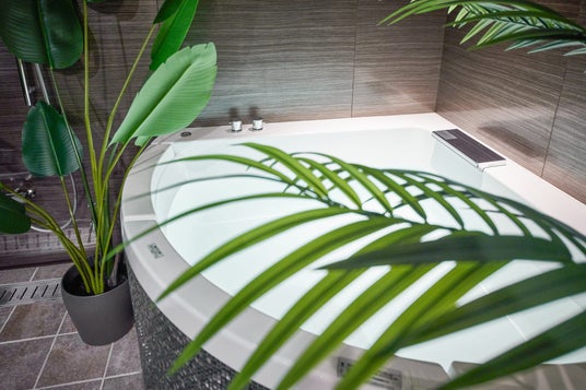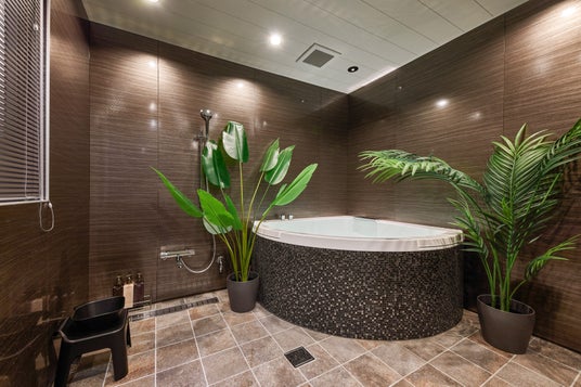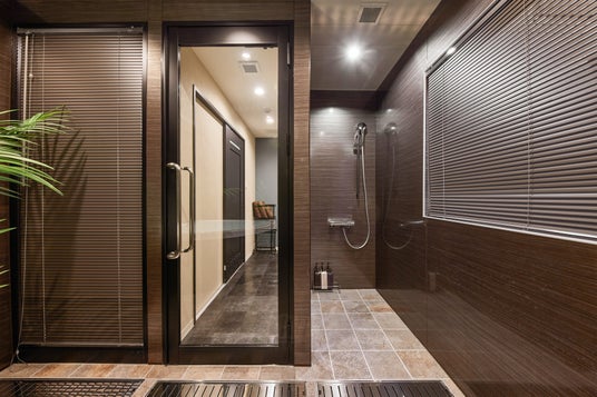 この施設の最大の魅力は、上階の浴室。約9平方メートル もある広い浴室には扇型の大きな浴槽と観葉植物、シャワーを2か所設置しています。全体的にトーンを落としたカラーコーディネートにする事で、浴室内をシックな雰囲気でまとめ、よりくつろげる空間になるよう意識しました。リラックスしながら入浴する事ができます。