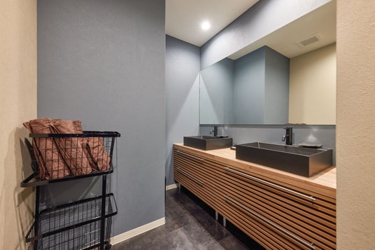 洗面脱衣室はダブルボウルの造作洗面を採用。ミラーは長尺タイプのものを使用し、ゆったりした水廻り空間設計にしました。この長尺ミラーもグループ旅行者を意識したもので、複数人同時にお化粧や身支度を行う事が可能です。