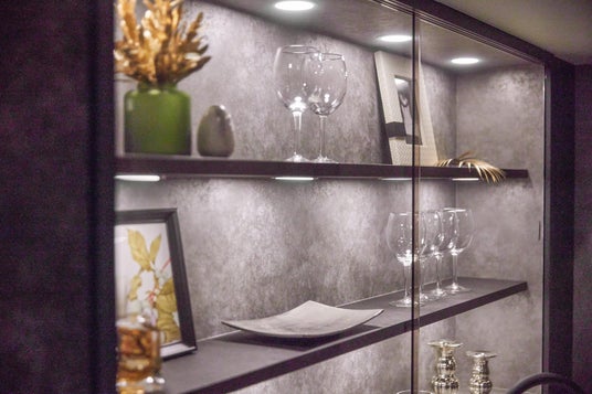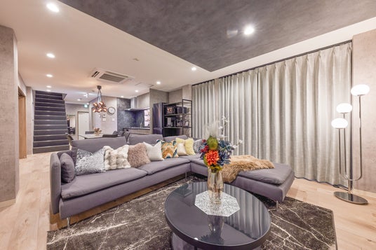 約20畳の広々したLDKスペースはシックでホテルライクな印象になるよう落ち着いた配色でインテリアコーディネートを行いました。キッチン背面の飾り棚やリビングには関節照明を設置。陰影にメリハリのある照明計画をする事で、ホテルライクな非日常の空間を演出しています。