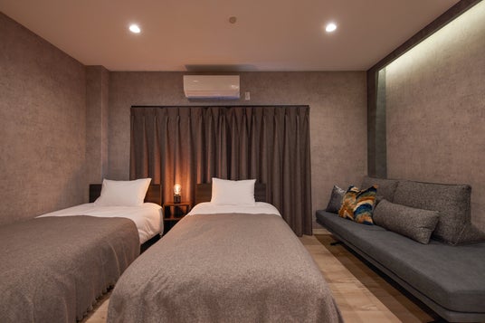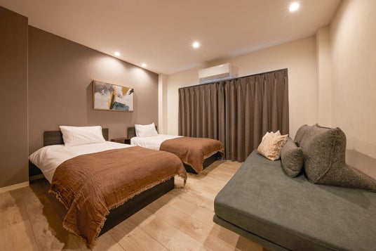 今回新しく誕生した「eni.nakazakicho」は大阪メトロ谷町線「中崎町」駅を出て徒歩1分。大通り沿いにあるビルの3階になります。メゾネットタイプであるこの部屋は、上下階で広さ約154平方メートル もあり、寝室は合計5部屋。グループ旅行はもちろん、長期旅行でも快適にお過ごしいただけるよう設計した大型民泊施設です。