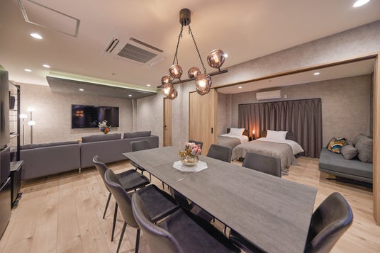 また、ダイニングの横にある寝室は大開口のドアを設置。すべて開けると寝室と一体化した大空間にする事も可能です。ご利用人数によって間取りを柔軟に変更できるのが大きな特徴です。