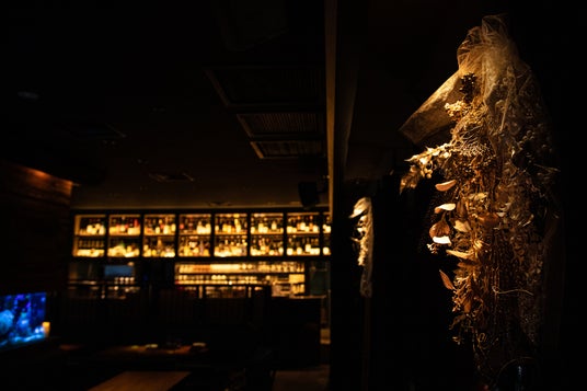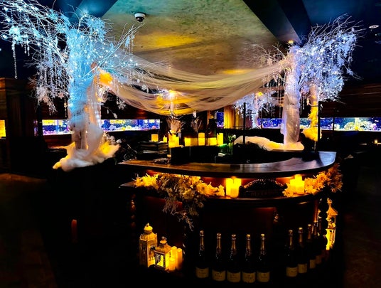 エントランスを抜け、天井まである重々しい木の扉を開けると雪や氷の世界をイメージした圧倒的な装飾に目を奪われる。さらに新宿ライムを象徴するアクアリウムがオーロラ色に煌めき、溢れるやわらかな光とキャンドルの揺らめく光が混ざり合い、店内はより一層、幻想的で非日常を感じることができる上質な大人の空間となっている。イルミネーションでライトアップされた光の空間で店内全体がフォトスポットに、