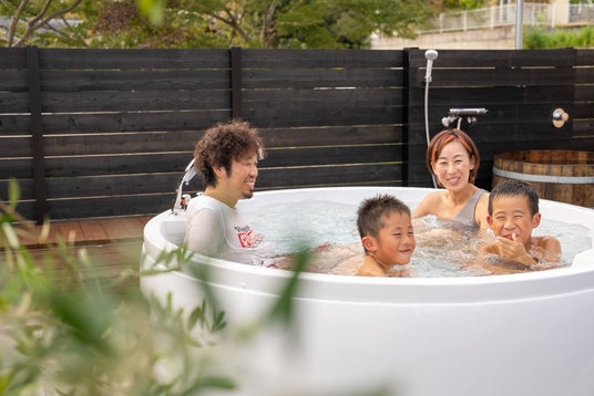 4~6人用の巨大ジャグジーが備え付けられており、屋外でのリラックスを体験できます。開放感あふれる空間で、サウナを楽しみながらくつろげます。
