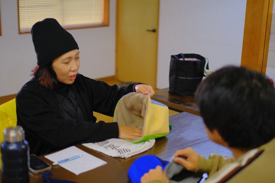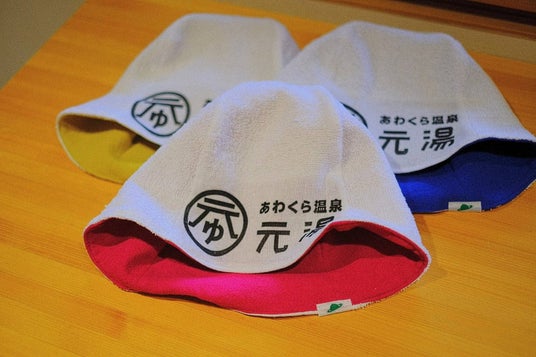 卵サウナオープンを記念し、2025年1月から2月に元湯に宿泊のうえサウナを体験された方全員に、「元湯オリジナルサウナハット」をプレゼントします。このハットは村内の帽子屋「UKIYO」が元湯の温泉タオルをそのまま活用してつくったオリジナルアイテム。綿麻のカラフルな裏地が付いており、リバーシブルで使用可能です。