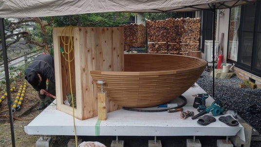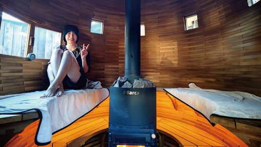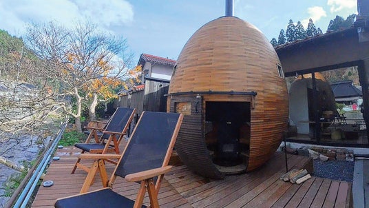 「卵サウナ」は村在住のサウナメーカー・Barca株式会社(代表:松尾淳平)が一段ずつ丁寧に木材を組み立て、中央にオリジナル薪ストーブを設置したアウトドアサウナです。流線型の美しさを追求しながらもサウナとしての高品質を確保。サウナ横には源泉掛け流しの水風呂と外気浴チェアを備え、年間平均15℃のラジウム泉で“ととのう”体験を提供します。