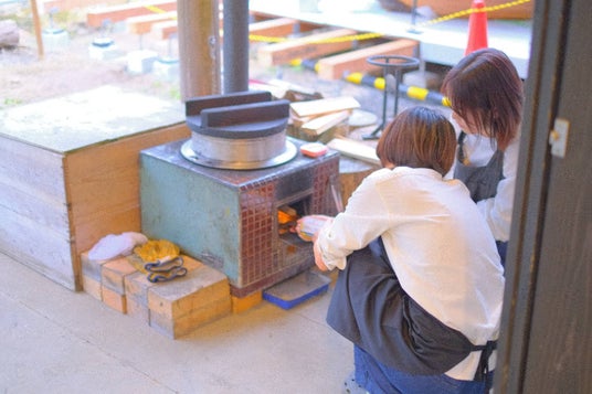 玄関前の釜戸でお米を炊く元湯スタッフ