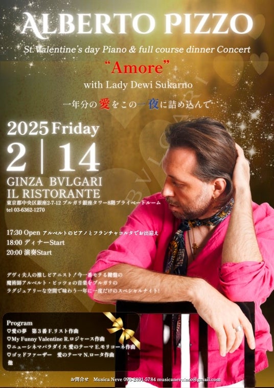 イタリアが誇る鍵盤の魔術師アルベルト・ピッツォがブルガリに初登場。一年分の愛をこの一夜に詰め込んだスペシャルナイト!ラグジュアリーな空間で実力派アーティストによる“アモーレ”をテーマにした音楽に酔いしれたい。