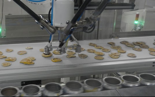 今回受賞した「レモンスライス装入システム」は、不均一な形状の乾燥レモンスライスをロボットハンドで吸着し高速搬送中の缶にレモンスライスを1枚ずつ装入する設備です。設備開発にあたっては非常に高い技術が必要でしたが、レモンスライス形状判断用カメラ、吸着のための特殊パッド、装入ロボットなどの組み合わせなどをゼロから開発することにより、技術課題を解決しました。さらに、複数のパラレルリンクロボットとAIによる検査を駆使することで、量産製造に適応させることに成功しました。