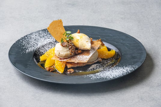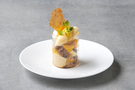 肉・魚どちらもお楽しみいただける「北薩摩プレート」は、肉質がやわらかい出水市の「南国元気鶏」をクリーム煮で仕上げ、アクセントに風味豊かな柚子胡椒をあしらいます。魚料理は甘みが豊富で締まった肉質と抜群の旨味が特徴の長島町産「鯛王(真鯛)」を蒸焼きにして、特有の香りとほろ苦さが特徴の「蕗」をソースにアレンジし、付け合わせにさつま町の「セレベス(里芋)」とネギを添えました。続いて、豊かな水資源と温暖な気候に恵まれた薩摩川内市産の鰻はふっくらしっとりと焼き上げて「うな重」に仕上げました。日本最大の鰻産地でもある鹿児島県の鰻を丸ごと1本分堪能いただけます。デザートは、鹿児島県オリジナルの品種となる阿久根市の柑橘類「大将季(だいまさき)」を紅茶のミルフィーユ仕立てでご用意します。紅茶風味のカスタードクリームとソース、バニラアイスの甘さに大将季の香りとコクのある味わいをお楽しみいただける一品です。
