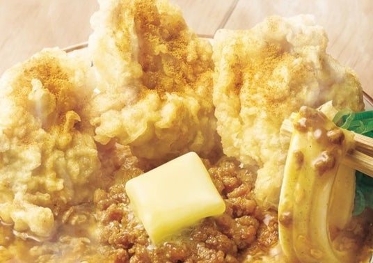 ジューシーさがたまらない食べ応えのある鶏天がごろっと3個。サックサクに揚がった衣にかける仕上げのカレー粉の香りが食欲をかきたてます。店内仕込みのカレーそぼろは、カレー粉で炒めて香りを出した挽き肉に、特製のかえしとかつおの粉末で旨みを加え、しょうがやにんにくでより力強い味わいに仕立てました。さらに、カレーそぼろの上で徐々に溶けるバターが全体にコクをたらします。だしの風味香るカレー玉子あんかけと、打ち立てのうどんがよくからみ、箸が止まらぬ一杯。味わいが何層にも重なる、この冬新登場のおいしさをお楽しみください。