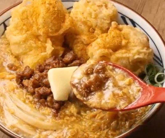 白だしがベースのあつあつでふわふわのカレー玉子あんかけは、いりこが香る仕立てに。丸亀製麺の定番商品『カレーうどん』に使われるカレーだしも加えることで、ピリッとしたカレーの味わいの中に、風味豊かなだしの香りがふわっと漂います。カレー玉子あんかけの玉子は、ふわふわな口当たりと玉子のコクをより楽しんでいただける、大きめの粒感に仕上げました。パンチの効いた味わいのカレーそぼろを徐々にくずして食べれば、味の変化が楽しめて、クセになること間違いなしです。