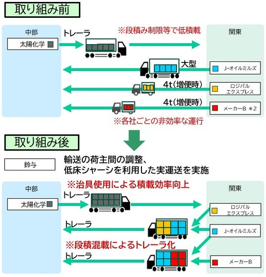 内 容: 中部~関東間の輸送で、ケースA-1と同様に荷物の段積み用治具を導入。パレットサイズや積み付け方法を標準化し、輸送効率を向上。出荷スケジュールを調整して定期往復輸送を実現しました。