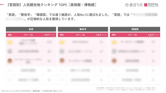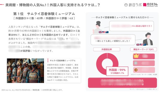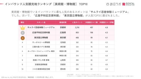業界最大級のインバウンドビジネスメディア「訪日ラボ」及び 店舗向け集客一元化プラットフォーム「口コミコム」を運営する株式会社mov(代表取締役:渡邊 誠、本社:東京都渋谷区、以下mov)は、国内の美術館・博物館に寄せられた最新の口コミデータから、独自の『インバウンド人気観光地ランキング』を発表しました。