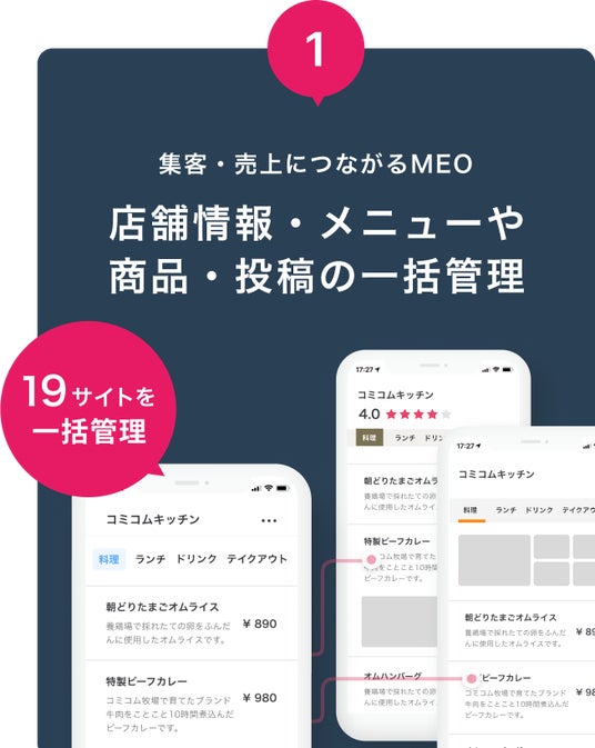 <口コミコム特徴その1>19サイトと連携!店舗情報・メニューや商品・投稿を一括管理
