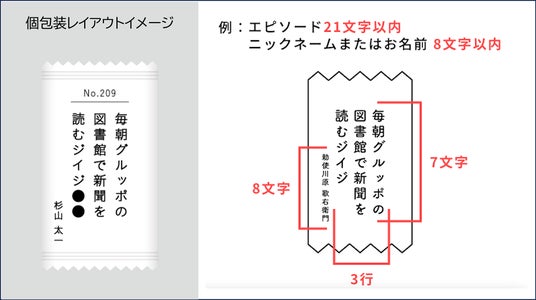 幸せを感じたできごとや場所やシーンを綴った21文字を専用サイトで募集し、選ばれた300の思い出を、ラムネをひと粒ずつ包むパッケージに印刷します。一袋には20粒程度が入り、今年の夏にオリジナルラムネ商品として完成予定です。