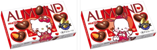 アーモンドの真っ赤なパッケージと同じ色の衣装をまとったハローキティとポチャッコがとってもかわいいパッケージです。アーモンドチョコレートもハートのデザインになってバレンタイン時期にぴったりです。(中身のアーモンドチョコレートは通常の形状です)
