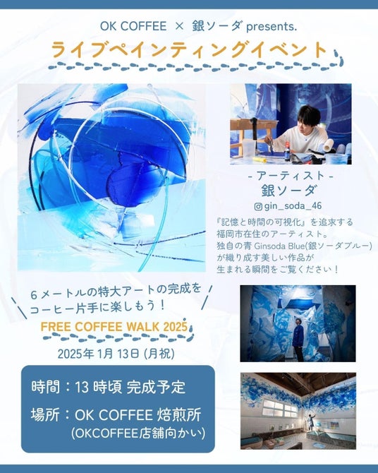 今年はさらにアート×町おこしの企画として、福岡市在住アーティスト 「銀ソーダ」さんによる6m級の特大アートのライブペインティングも実施。“Ginsoda blue”と呼ばれる美しい青のコントラストをお楽しみください。