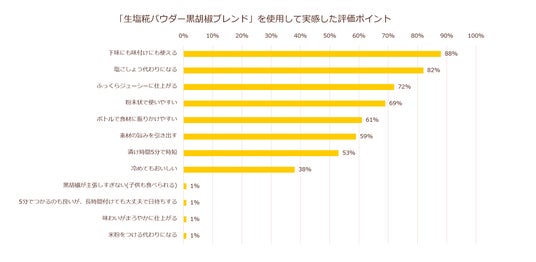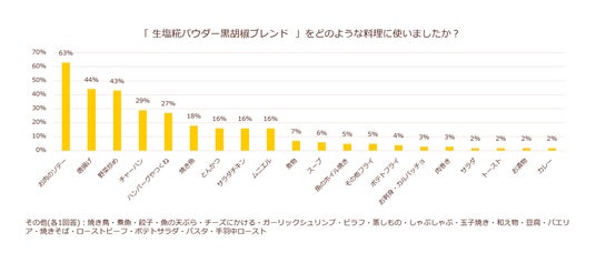 本商品を使用した料理としても、「お肉のソテー」「唐揚げ」のように、「やわらかくなる、旨味UP」といった効能に限らず、下味効果があることによってより評価が高くなる料理から、野菜炒め・チャーハンといった味付けに使う料理まで幅広く、「黒胡椒」をブレンドしたことによる新たな可能性が浮き彫りになったと考えます。