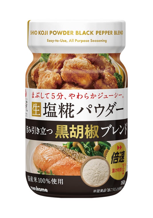 既存の生塩糀パウダーを、様々な料理の下味に使える調味料としてさらにブラッシュアップ。うまみを引き出すことはもちろん、黒胡椒によって味にパンチを与えます
