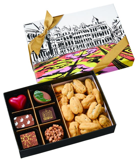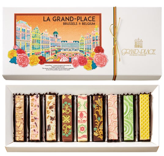 ベルギーのグランプラス広場とフラワーカーペットをモチーフにした化粧箱に、一番人気の定番商品ペカンナッツショコラ キャラメルと、職人がひとつひとつ丁寧に手作りしている見た目も華やかで味わいも楽しめるトリュフを詰め合わせたグランプラスのスペシャリテ。