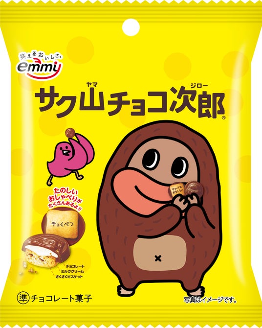 「サク山チョコ次郎」は、株式会社正栄デリシィより発売されている、ミルククリームが中に入ったチョコレートとサクサクビスケットを組み合わせた大人気のお菓子です。チョコレート部分は商品名にもなっているチョコジローというキャラクターの全30種の表情でかたどられ、ビスケットにはチョコジローが使う「チョ」が特徴的なチョコジロー語が全100種プリントされています。