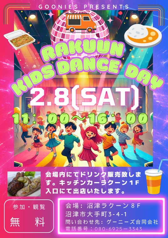 子どもたちが主役のダンスイベント「RAKUUN Kids Dance Day」をラクーン沼津で開催します!昼間は家族みんなで楽しめるキッズダンス発表の場、夜は大人向けのディスコパーティーと、昼夜で異なる楽しみが満載!