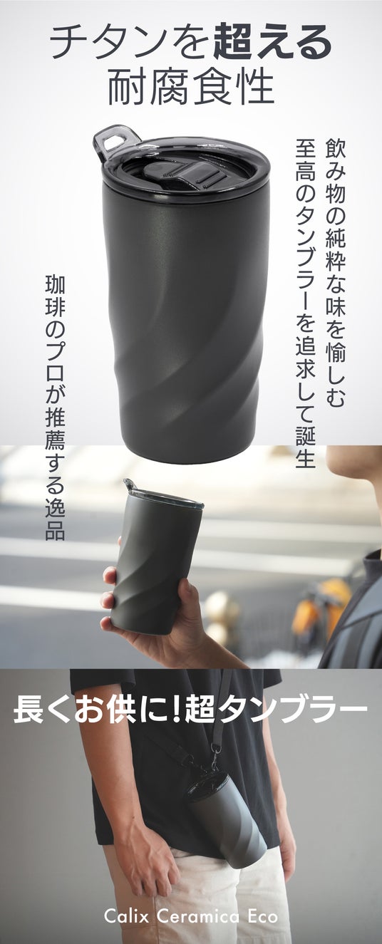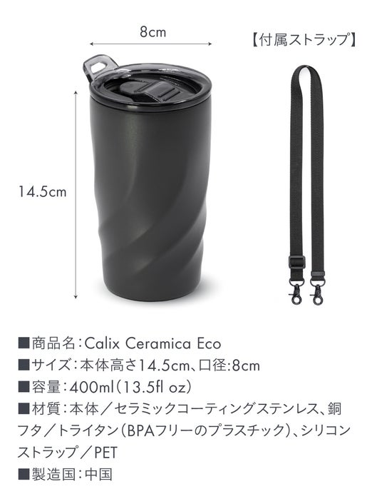 現在において仕事の小休憩やカフェでのリラックスタイム等、様々な場面で登場するタンブラー。「Calix Ceramica Eco」は、これまで主流であったステンレス製独特の金属臭や色うつりといったウィークポイントを解消した、新感覚のストラップ付き真空断熱タンブラーです。