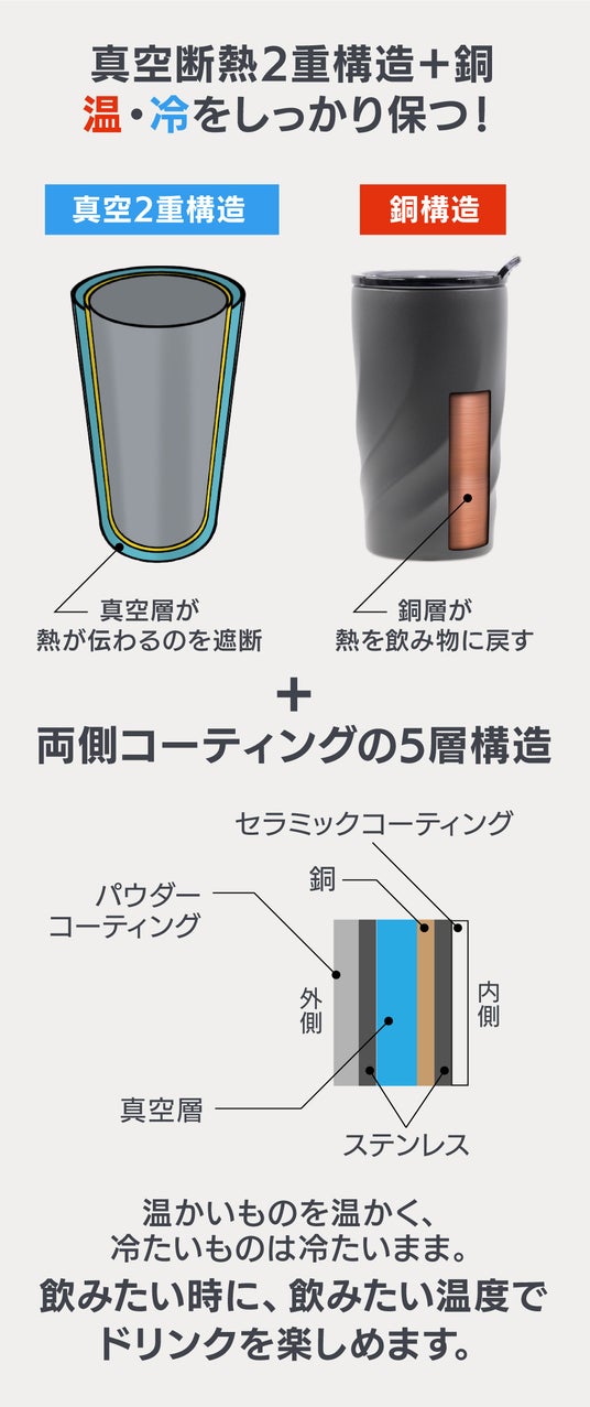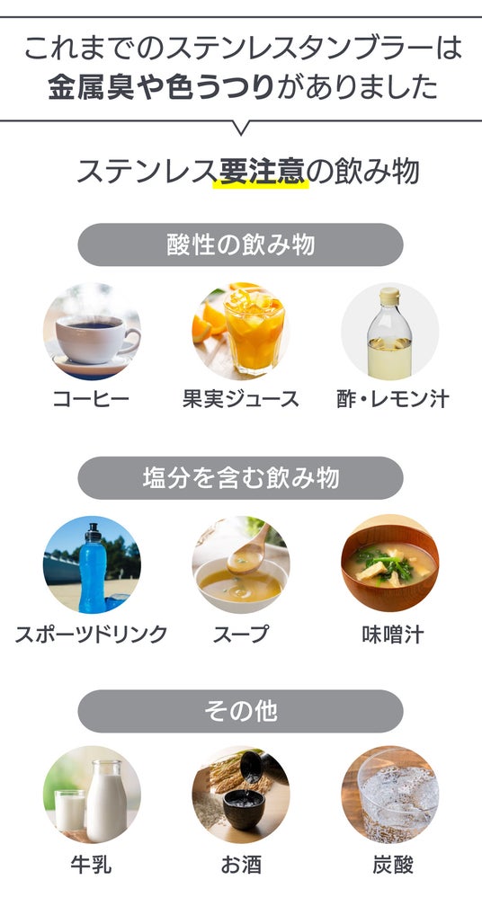 従来のステンレス製タンブラーにあった金属臭や色うつりといった、飲み物本来の味わいを損ねてしまう課題を、優れたセラミックコーティングの技術で解消しました。また、ステンレス製における要注意の飲み物 (コーヒーや果汁ジュースのような酸性の飲み物、スポーツドリンクや味噌汁のような塩分を含む飲み物、炭酸、乳製品、酒類等)についても、当製品においては その種類を問わず入れることが可能です。